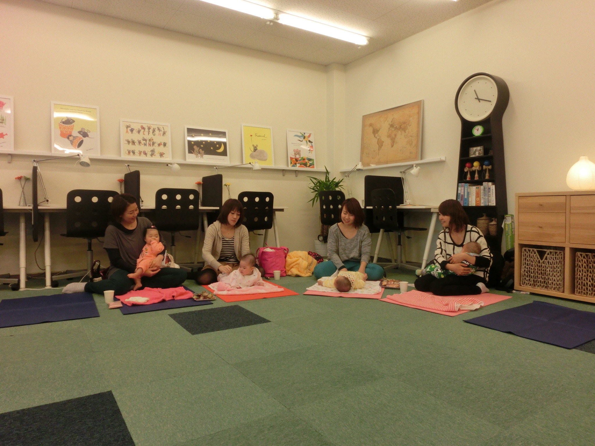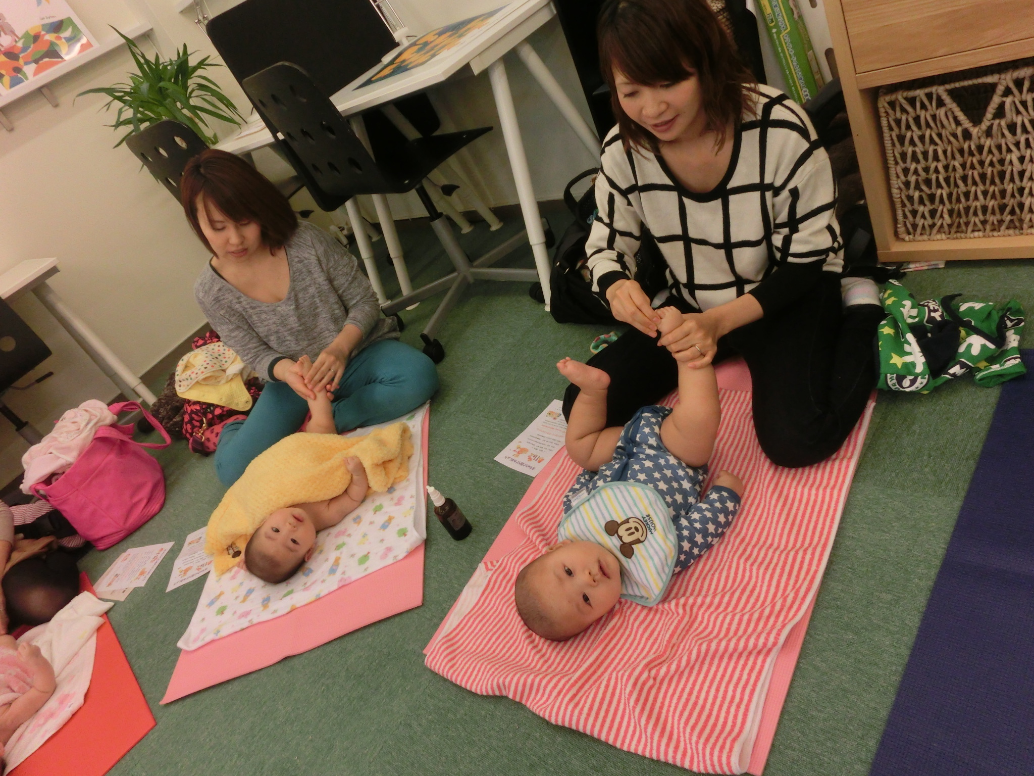 今日は、ふれあい遊びとして『くまさんくまさん♪』をしました。歌に合わせておててを上げたり、あんよを上げたりするだけですが、赤ちゃんにとってはとてもよい運動になります。体を動かすことで、赤ちゃんは幸せを感じます!歌が終わるとママも赤ちゃんの表情もとてもリラックス♪ マッサージの準備オッケーです!!